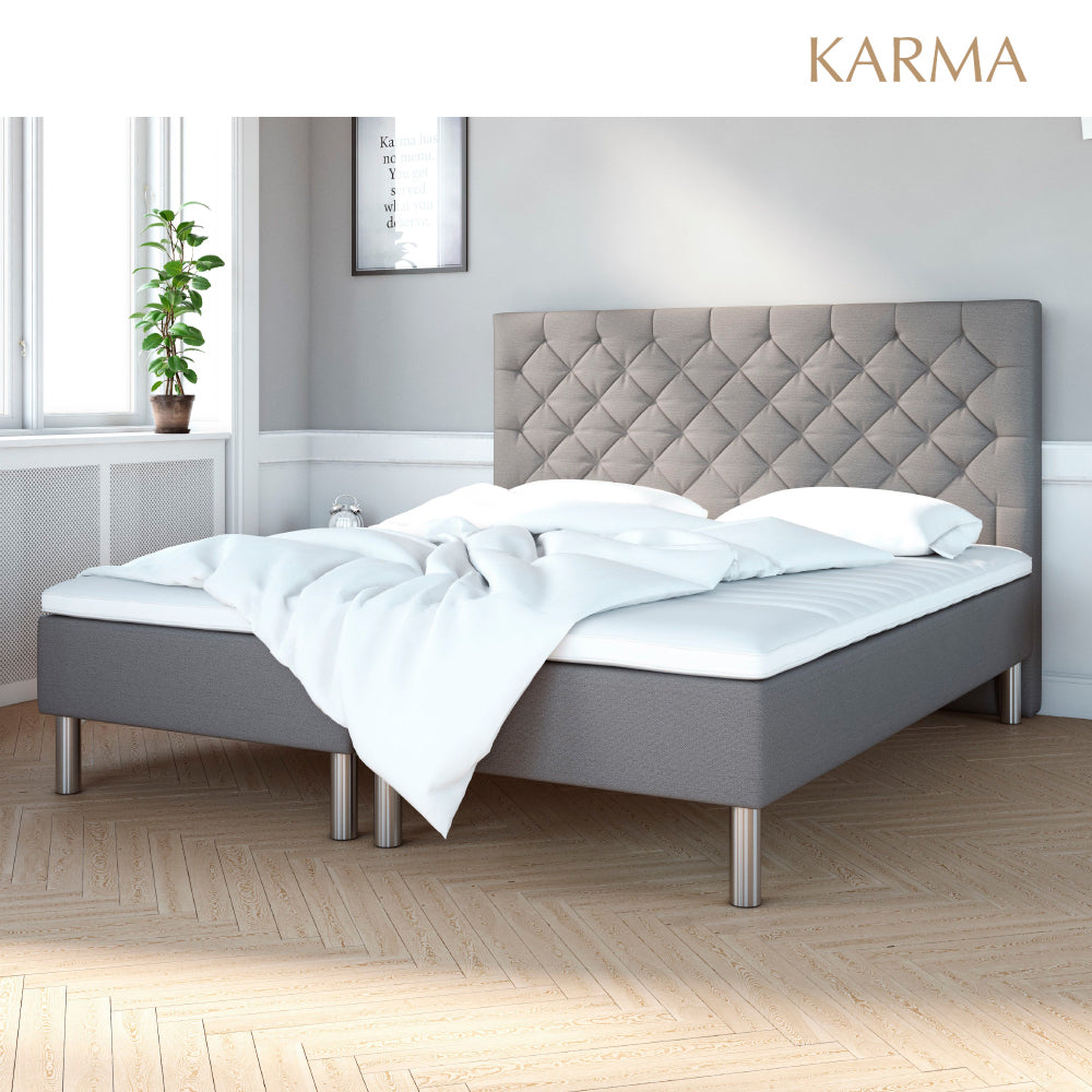 Karma Classic Boxmadrasser str. 160x200 cm er opbygget med 2 lag fjedre, hvoraf det øverste består af 250 5-Zonet pocketfjedre pr.m2 og 150 Bonell fjedre i bundrammen. Bolstret med møbelstof i 3 farver ( Lysegrå, Antracit, Sand ), så man kan nøjes med kuvertlagen på topmadrassen. Vælg mellem Medium, Fast eller X-Fast hårdhedsgrad. Incl. 6 cm latex topmadras.