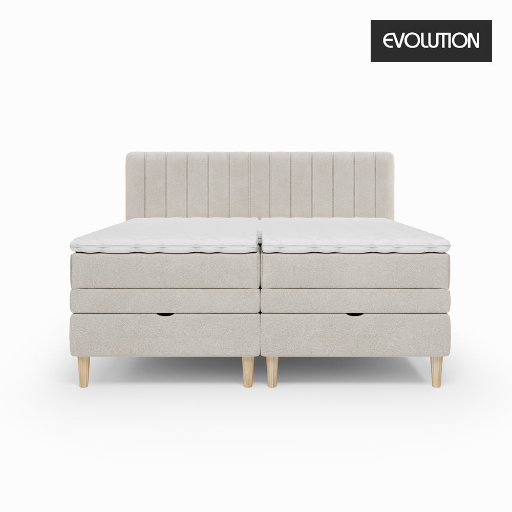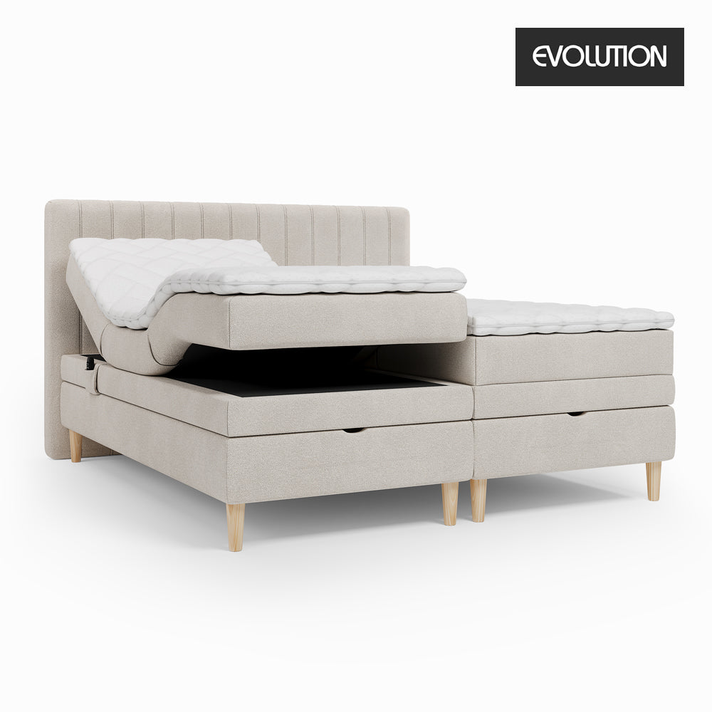 Evolution 400 Box Elevationsseng m/ Opbevaring str. 180x200 cm incl. flot hovedgavl, 15 cm runde koniske ben i eg og 3 topmadras modeller. Madrassen har 7-Zonet Pocketfjedre der giver en god fast støtte og er fastmonteret på elevationsdelen, så madrassen ikke kan forskubbe sig. Boxelevationsbunden har en ekstra kraftig konstruktion og kan eleveres meget højt i både hoved og benenden. Sengen har derudover praktisk opbevaring som nemt kan tilgås ved at løfte bunden op fra fodenden via lift pumper.