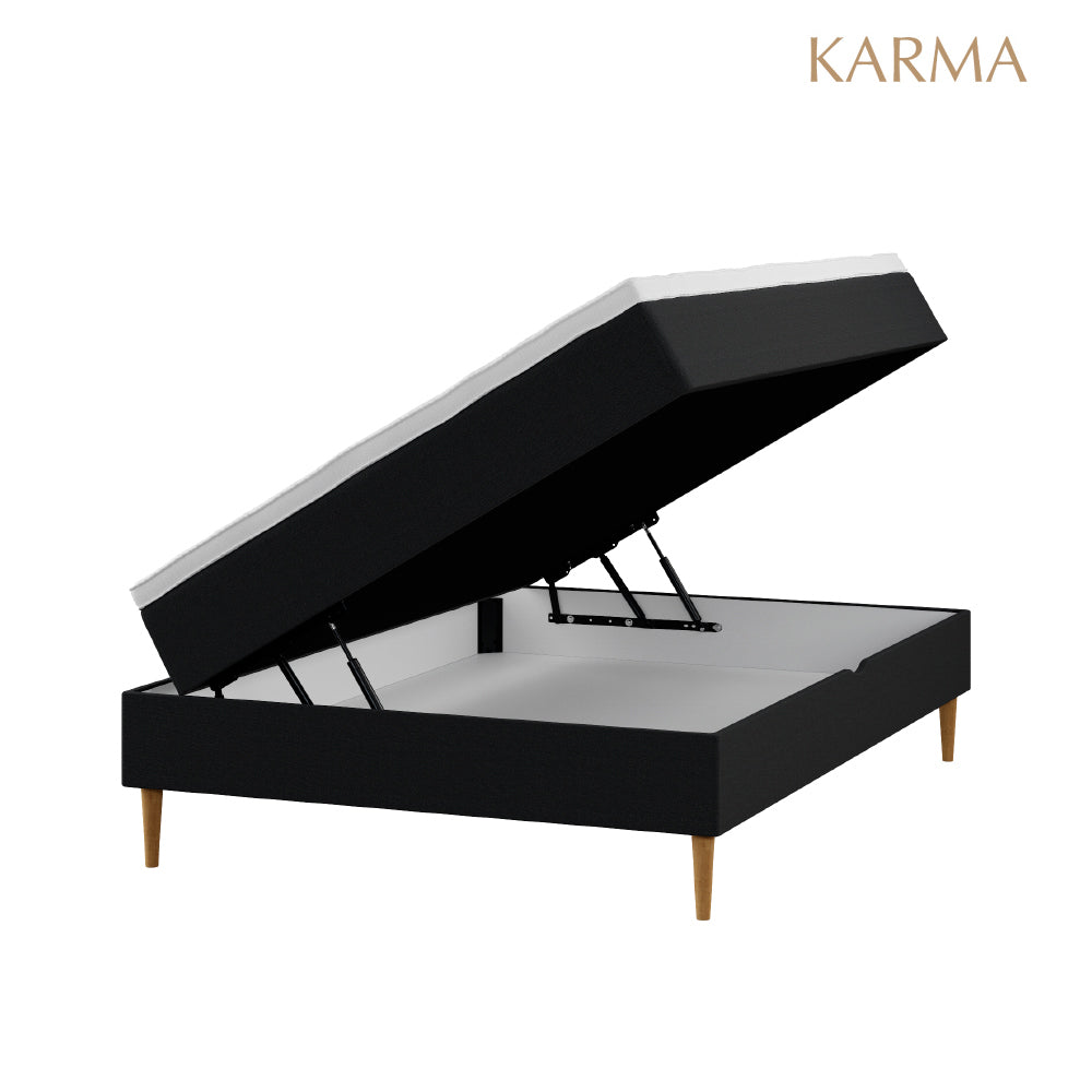 Karma Classic Kontinental seng m/ opbevaring str. 140x200 cm. Sengen er opbygget med 3 lag i flot hotellook. Springmadras med 1 stor madraskerne som har 250 5-Zonet pocketfjedre pr.m2 og polstret med polyskum. Magasin Basen gør at du får et rum til opbevaring og dette tilgås nemt med det smarte pumpesystem. Sengen er bolstret med møbelstof i 3 farver ( Lysegrå, Antracit, Sand ), så man kan nøjes med kuvertlagen på topmadrassen.