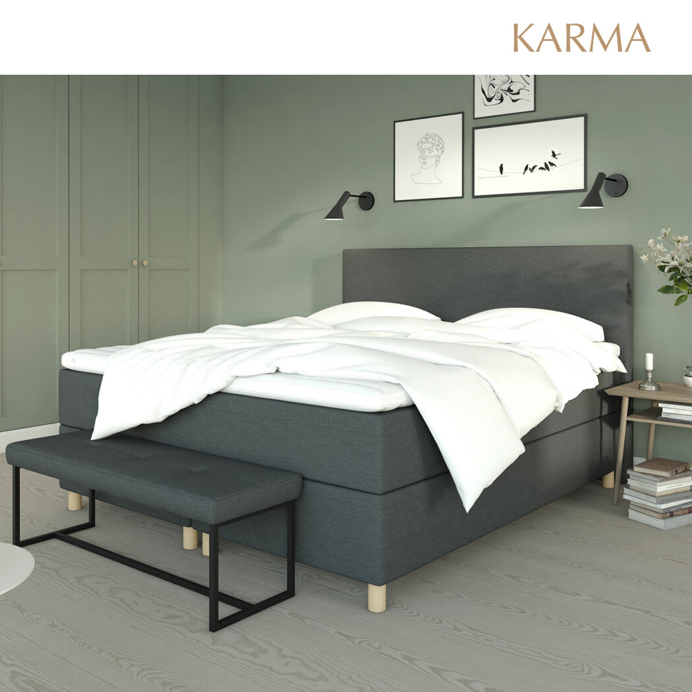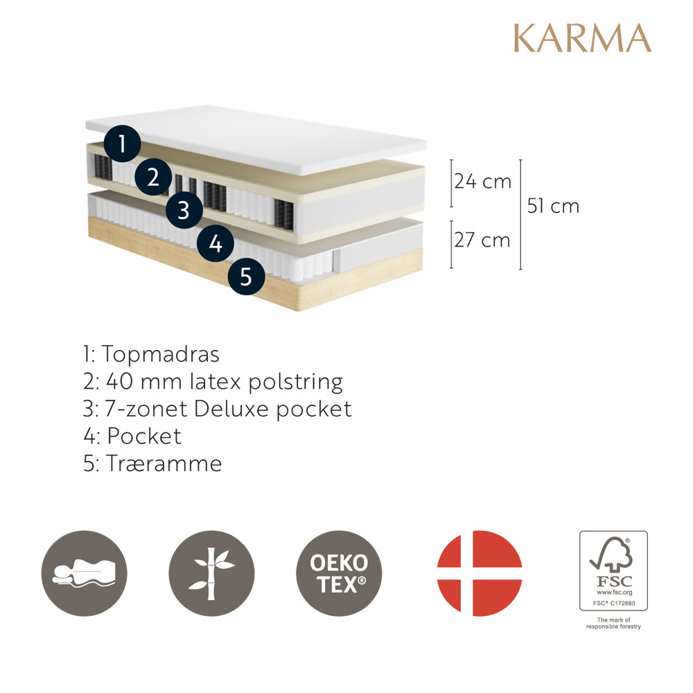 Karma Premium Kontinentalseng str. 180x200 cm med 16 cm høje 7-Zonet Deluxe pocketfjedre og latex polstring som giver optimal komfort og åndbarhed. Sengen har i alt 500m2 Pocketfjedre fordelt i 2-lag ( Madras + Underdel ) som kombineret med latexen giver god støtte og aflastning. Sengen føres i 3 design ( Standard, Seamless, Full Cover )