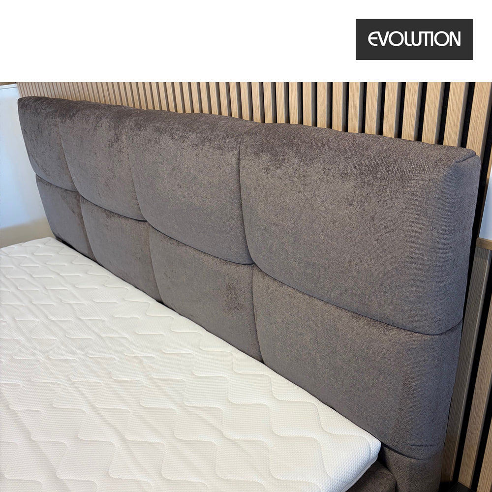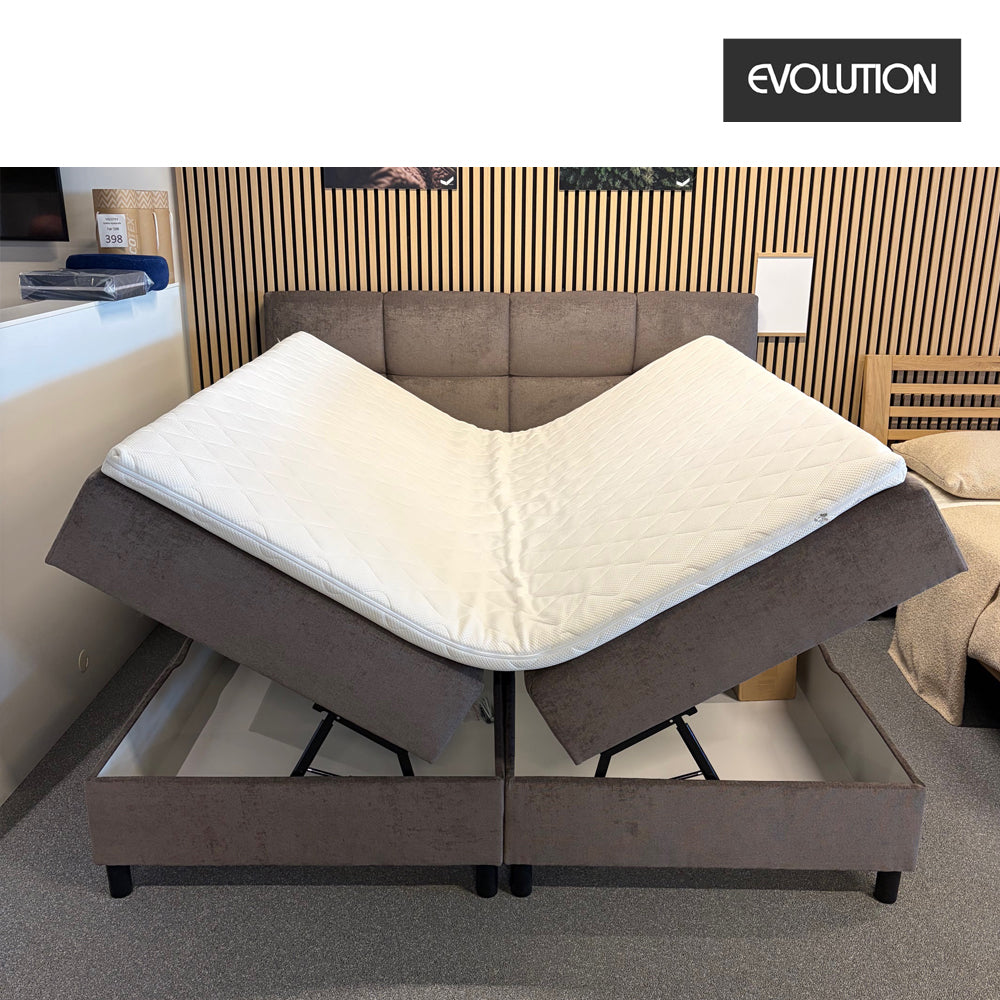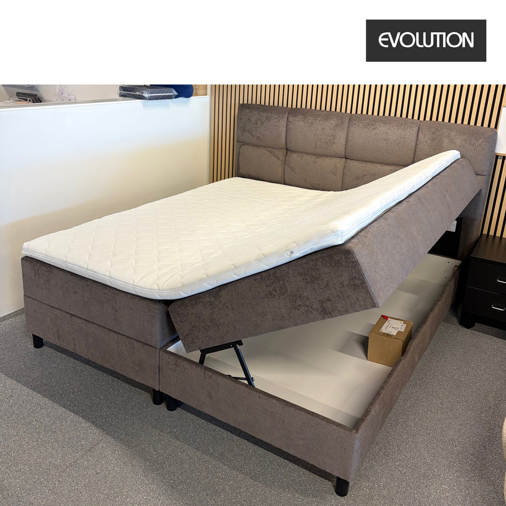 Evolution 300 Opbevaringsseng ( Demo model ) incl. hovedgavl og ben str. 180x200 cm. Sengen er opbygget med solid konstruktion og 2 slags ben medfølger ( 8 stk. Sort plast eller 8 stk. Ben i Egetræ. Smart Hovedgavl m/ bobbel syet felter, fuldender det flotte design. Magasin Basen m/ opbevaring tilgås nemt på siden med det solide pumpesystem og sengen er beklædt med flot møbelstof i Gråbrun farve.